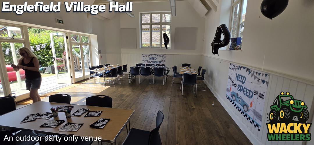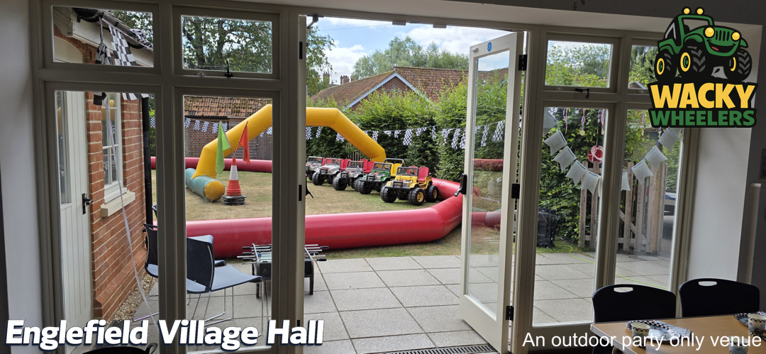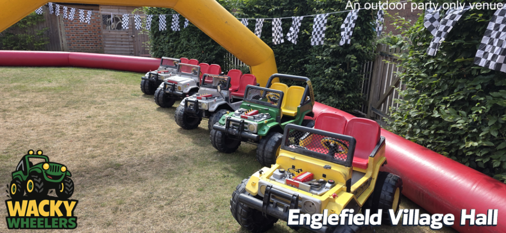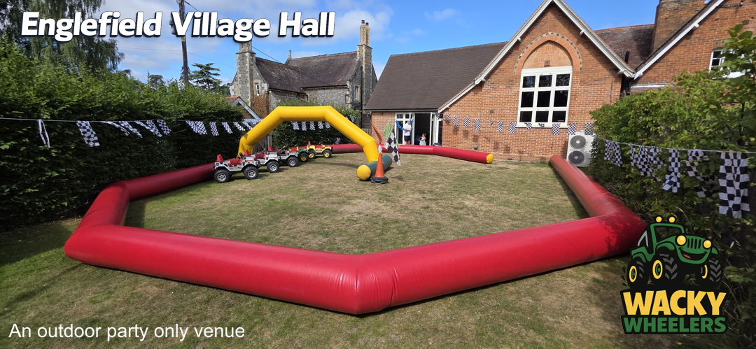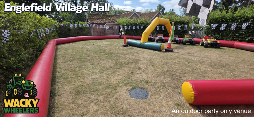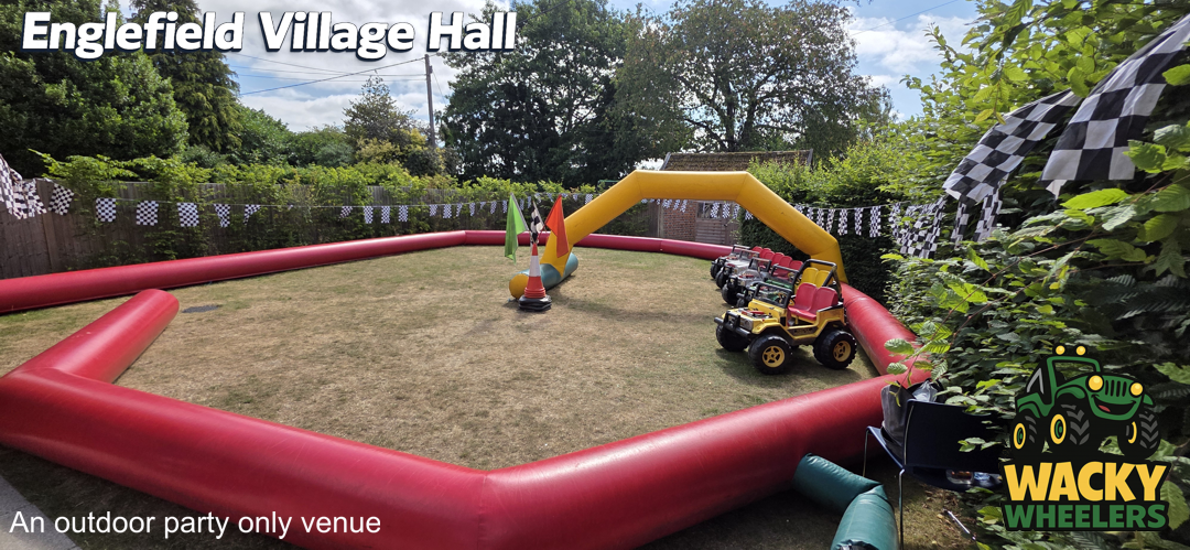 Englefield Village Hall, near Pangbourne, offers a unique and highly popular setting for Wacky Wheelers kids’ parties, thanks to its fantastic enclosed outdoor garden. While the indoor hall isn’t suitable for the track itself, the secure outdoor space is perfect for safe, high-energy riding, giving children plenty of room to enjoy the full Wacky Wheelers experience. The indoor hall then provides an ideal base for party food, seating, and celebrations, creating a smooth and well-balanced party setup. This venue is available for Wacky Wheelers outdoor parties from mid-March through to mid-September, making the most of the warmer, drier months.