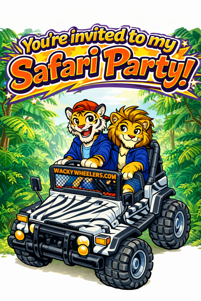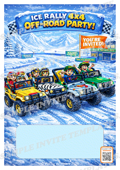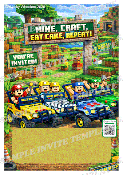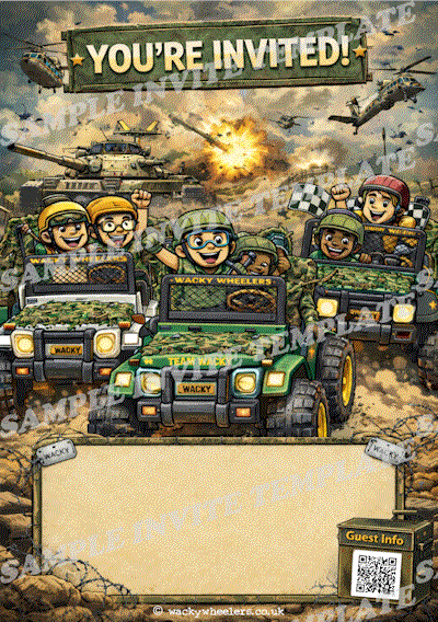 Once you have decided on booking a Wacky Wheelers party and have made a Provisional Booking we will give you access to our custom invite system. We have dozens of designs, which will hopefully work well with your party theme. Our system allows you to download an empty invite or you can input the details and download them as a single graphic for sending via Whatsapp or as a print ready pdf.