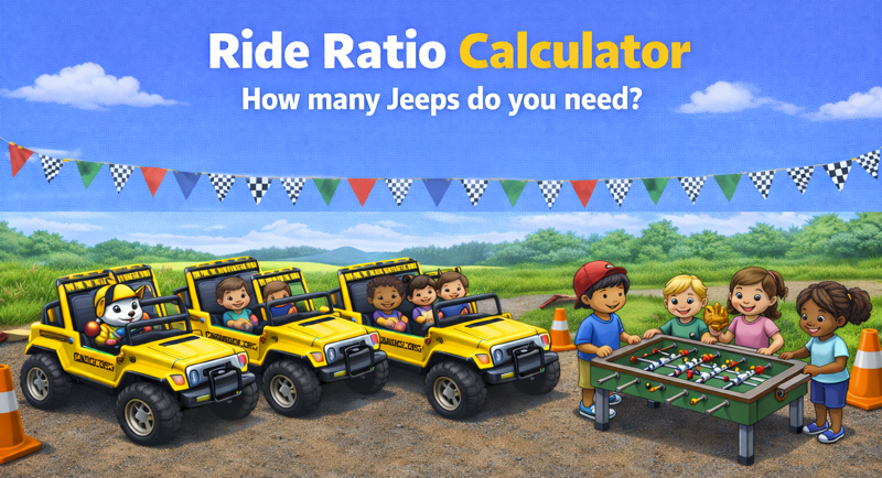 This page is just a guide for approximately how many sessions a partygoer will spend in a 2 seater Jeep. Enter the number of attendees you expect to participate, and then how many Jeeps you are thinking of booking. As an optimum, somewhere between 1:3 or 1:4 is what you’ll be looking for.